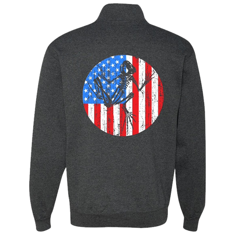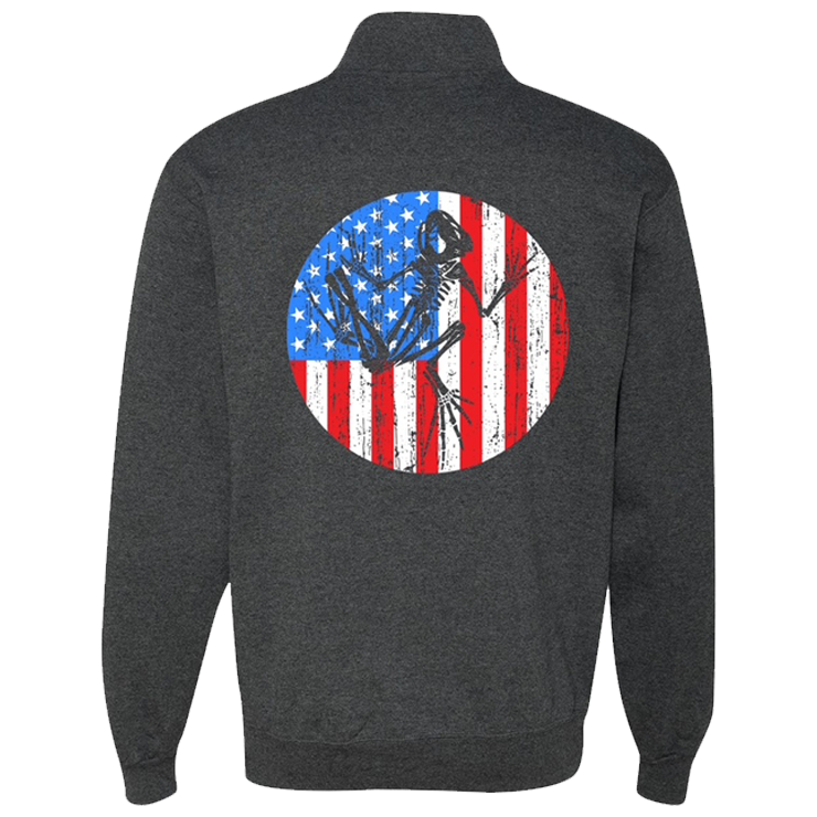 - Screenprint Back Design: Distressed Circle American Flag behind Black Bone Frog