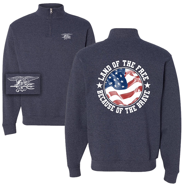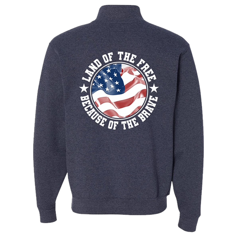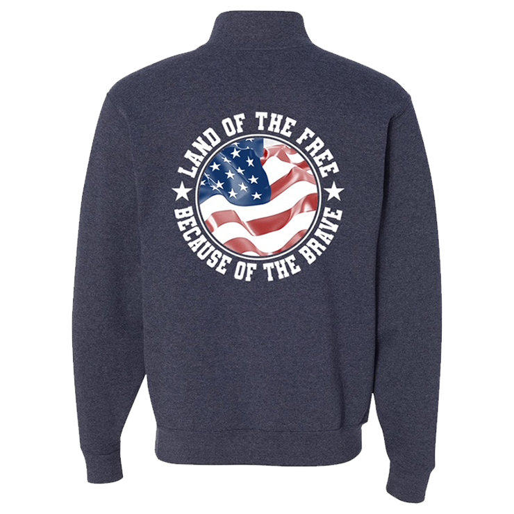 - Screenprint Back Design: LAND OF THE FREE BECAUSE OF THE BRAVE with White Stars (Text and Stars in White) Circling Red/White/Blue Waving American Flag on Back of Sweatshirt