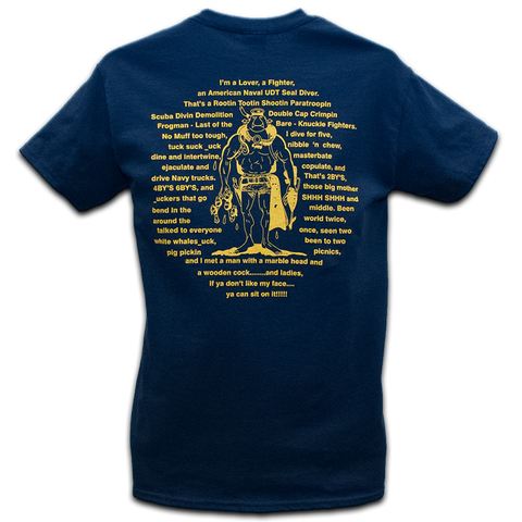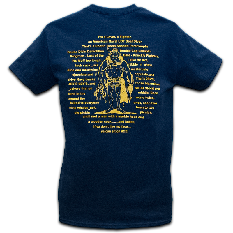 - Front of Shirt on Left Chest is a Trident. On Back of Shirt....I'm a Lover, a Fighter, an American Naval UDT SEAL Diver
