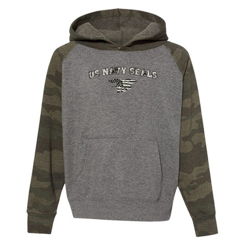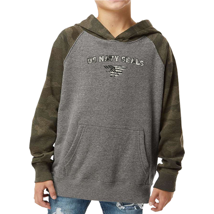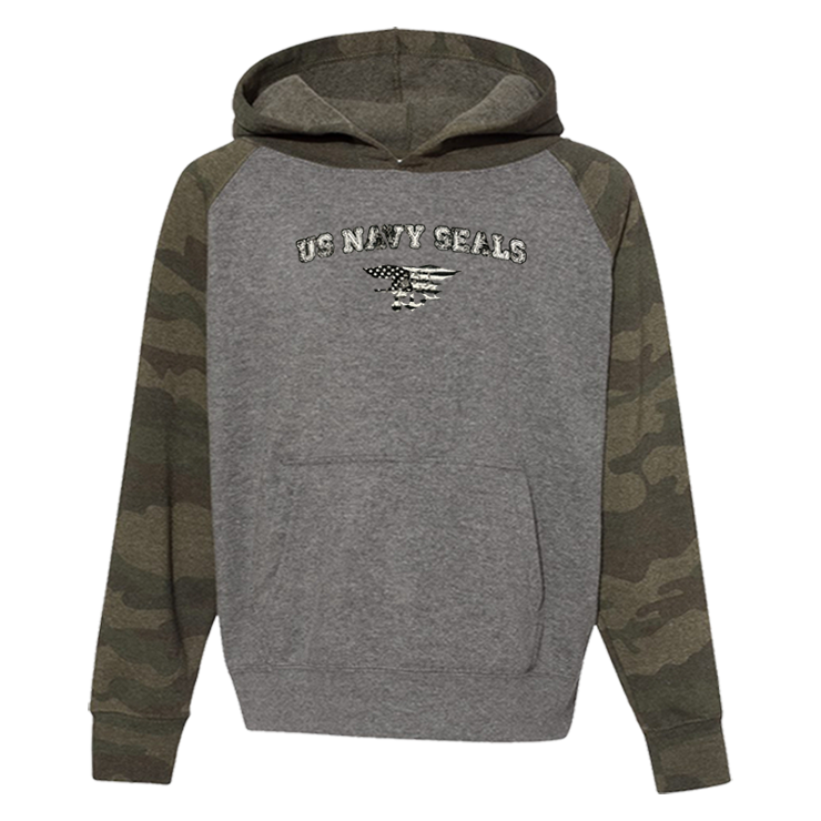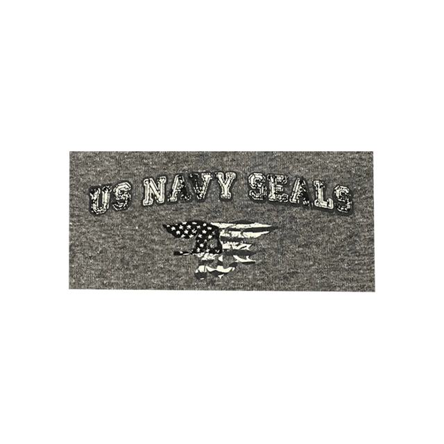 - Screenprint: Distressed US NAVY SEALS above Trident Flag with Black/White/Gray Colors on Center Chest